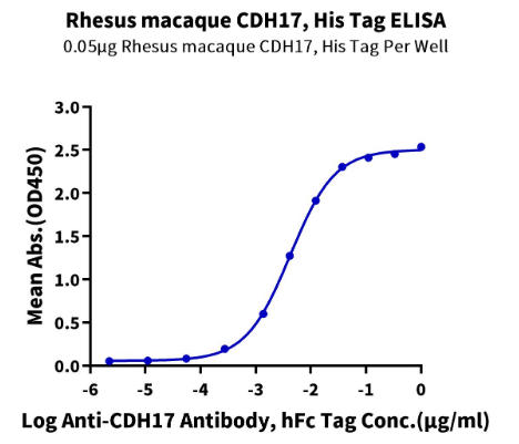 | Bio-activity : | Immobilized Rhesus macaque CDH17, His Tag at 0.5μg/ml (100μl/well) on the plate. Dose response curve for Anti-CDH17 Antibody, hFc Tag with the EC50 of 4.2ng/ml determined by ELISA. |
