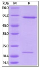 | Molecular Mass : | This protein carries a polyhistidine tag at the C-terminus. This protein undergoes autocatalytic cleavage to release the pro-peptide and mature chain. The pro-peptide and mature chain are associated through non‑covalent interactions and with a calculated MW of 13.9 kDa and 59.4 kDa respectively. The protein migrates as 17 kDa and 60-66 kDa under reducing (R) condition (SDS-PAGE) due to glycosylation. |