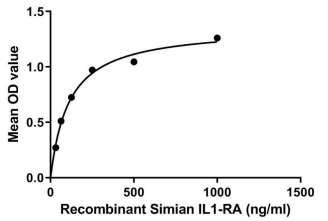 The interleukin-1 receptor antagonist (IL-1RA) is a member of the interleukin 1 cytokine family. IL1Ra is secreted by various types of cells including immune cells, epithelial cells, and adipocytes, and is a natural inhibitor of the pro-inflammatory effect of IL1β. IL-1RN is an agent that binds to the cell surface interleukin-1 receptor (IL-1R), which would prevent IL-1 from intracellular signal transduction. Thus, a binding ELISA assay was conducted to detect the interaction of recombinant simian IL-1RN and recombinant human IL-1R1. Briefly, IL-1RA were diluted serially in PBS, with 0.01% BSA (pH 7.4). Duplicate samples of 100μl were then transferred to IL-1R1-coated microtiter wells and incubated for 2h at 37°C. Wells were washed with PBST and incubated for 1h with anti-IL-1RN pAb, then aspirated and washed 3 times. After incubation with HRP labelled secondary antibody, wells were aspirated and washed 3 times. With the addition of substrate solution, wells were incubated 15-25 minutes at 37°C. Finally, add 50µl stop solution to the wells and read at 450nm immediately. The binding activity of IL-1RA and IL-1R1 was shown, and this effect was in a dose dependent manner. |