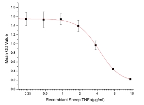 | Bio-activity : | Tumor necrosis factor (TNF, tumor necrosis factor alpha, TNFα, cachexin, orcachectin) is a cell signaling protein (cytokine) involved in systemic inflammation and is one of the cytokines that make up the acute phase reaction. The primaryrole of TNF is in the regulation of immune cells. TNF, being an endogenouspyrogen, is able to induce fever, apoptotic cell death, cachexia, inflammation and to inhibit tumorigenesis and viral replication and respond to sepsis viaIL1&IL6 producing cells. To test the effect of TNFα on cell apoptosis, A549 cellswereseeded into 96-well plates at a density of 4,000 cells/well with 5% serum standard DMEM including various concentrations of recombinant sheep TNFα. After incubated for 48h, cells were observed by inverted microscope and cell proliferation was measured by Cell Counting Kit-8 (CCK-8). Briefly, 10µl of CCK-8 solution was added to each well of the plate, then the absorbance at 450nm was measured using a microplate reader after incubating the plate for 1h at 37°C. Proliferation of A549 cells after incubation with TNFα for 72h observed by inverted microscope was shown. Cell viability was assessed by CCK-8(Cell Counting Kit-8 ) assay after incubation with recombinant sheep TNFα for 72h. It was obvious that TNFα significantly inhibit cell viability of A549 cells. The ED50 is 4.3μg/mL. |