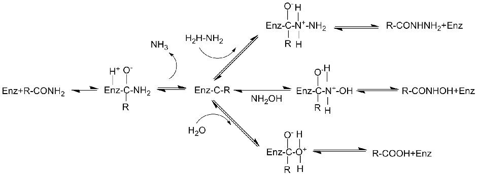 In addition to catalyzing the hydrolysis of amides, amidase can also catalyze acyl transfer reactions in the presence of co-substrates such as hydroxylamine.