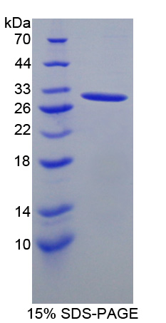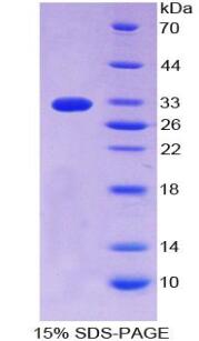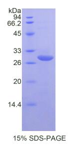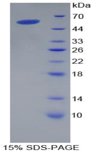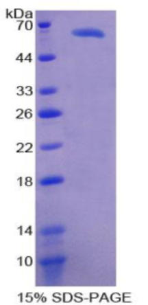 Human GITR Ligand, Fc Tag on SDS-PAGE under reducing (R) condition. The gel was stained overnight with Coomassie Blue. The purity of the protein is greater than 95%. (TNFSF18-37H)