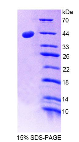 Human GITR Ligand, Fc Tag on SDS-PAGE under reducing (R) condition. The gel was stained overnight with Coomassie Blue. The purity of the protein is greater than 95%. (TNFSF18-37H)