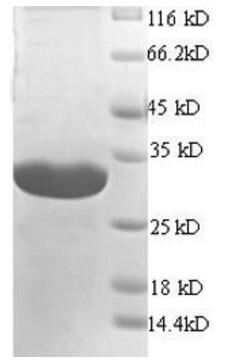 Human GITR Ligand, Fc Tag on SDS-PAGE under reducing (R) condition. The gel was stained overnight with Coomassie Blue. The purity of the protein is greater than 95%. (TNFSF18-37H)