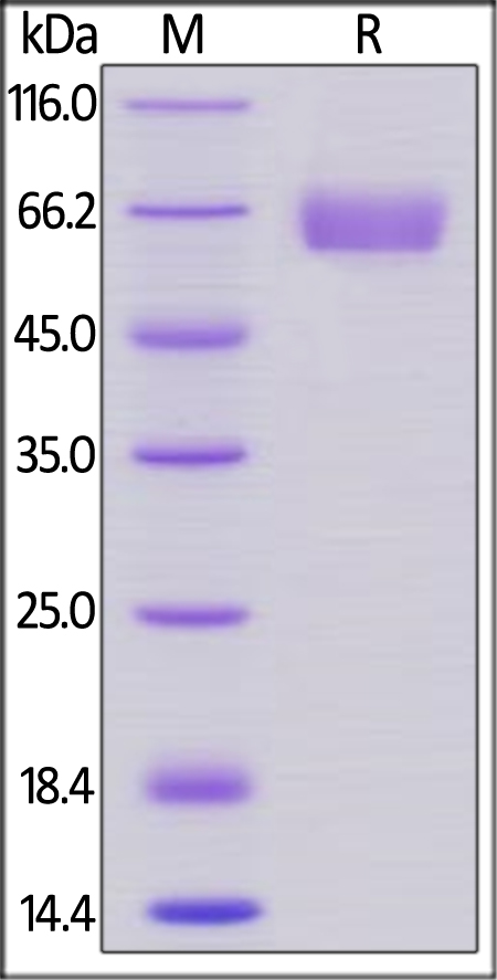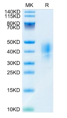Human GITR Ligand, Fc Tag on SDS-PAGE under reducing (R) condition. The gel was stained overnight with Coomassie Blue. The purity of the protein is greater than 95%. (TNFSF18-37H)