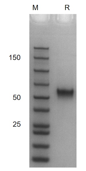 Human GITR Ligand, Fc Tag on SDS-PAGE under reducing (R) condition. The gel was stained overnight with Coomassie Blue. The purity of the protein is greater than 95%. (TNFSF18-37H)
