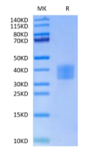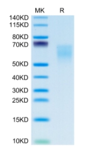 Human GITR Ligand, Fc Tag on SDS-PAGE under reducing (R) condition. The gel was stained overnight with Coomassie Blue. The purity of the protein is greater than 95%. (TNFSF18-37H)