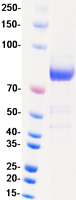 Human GITR Ligand, Fc Tag on SDS-PAGE under reducing (R) condition. The gel was stained overnight with Coomassie Blue. The purity of the protein is greater than 95%. (TNFSF18-37H)
