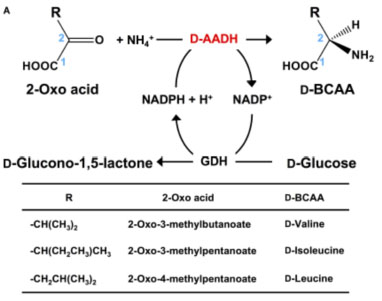 D-AADH (D-Amino acid dehydrogenase) is an enzyme that can reduce 2-keto acid into corresponding D-amino acid. The reaction need NADP(H) and inorganic ammonia donor (such as ammonia or ammonium ion). |