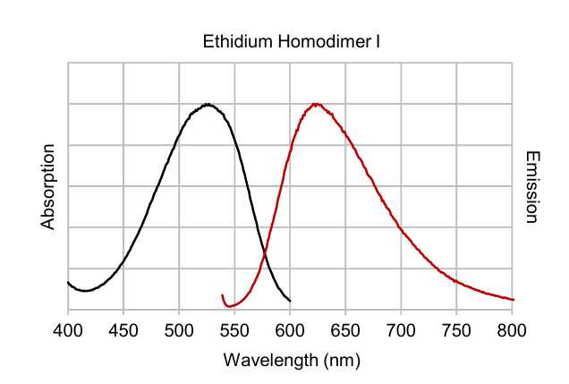 | Absorption/Emission : | 527/624 nm* (with DNA) *Ethidium Homodimer I also has a strong UV absorbance peak at 279 nm |