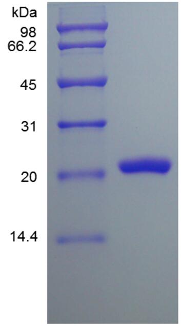 Fibroblast growth factor-9 (FGF-9) is a member of the fibroblast growth factor (FGF) family. All FGF family members are heparin binding growth factors with a core 120 amino acid (a.a.) FGF domain that allows for a common tertiary structure. FGF-9 plays an important role in the regulation of embryonic development, cell proliferation, cell differentiation and cell migration. This protein was isolated as a secreted factor that exhibits a growth-stimulating effect on cultured glial cells. FGF-9 is a monomer and interacts with FGFR1, FGFR2, FGFR3 and FGFR4. The human FGF-9 shares 98 % a.a. sequence identity with mouse, rat, equine, porcine, and bovine FGF-9. |