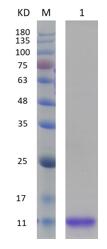 Human GITR Ligand, Fc Tag on SDS-PAGE under reducing (R) condition. The gel was stained overnight with Coomassie Blue. The purity of the protein is greater than