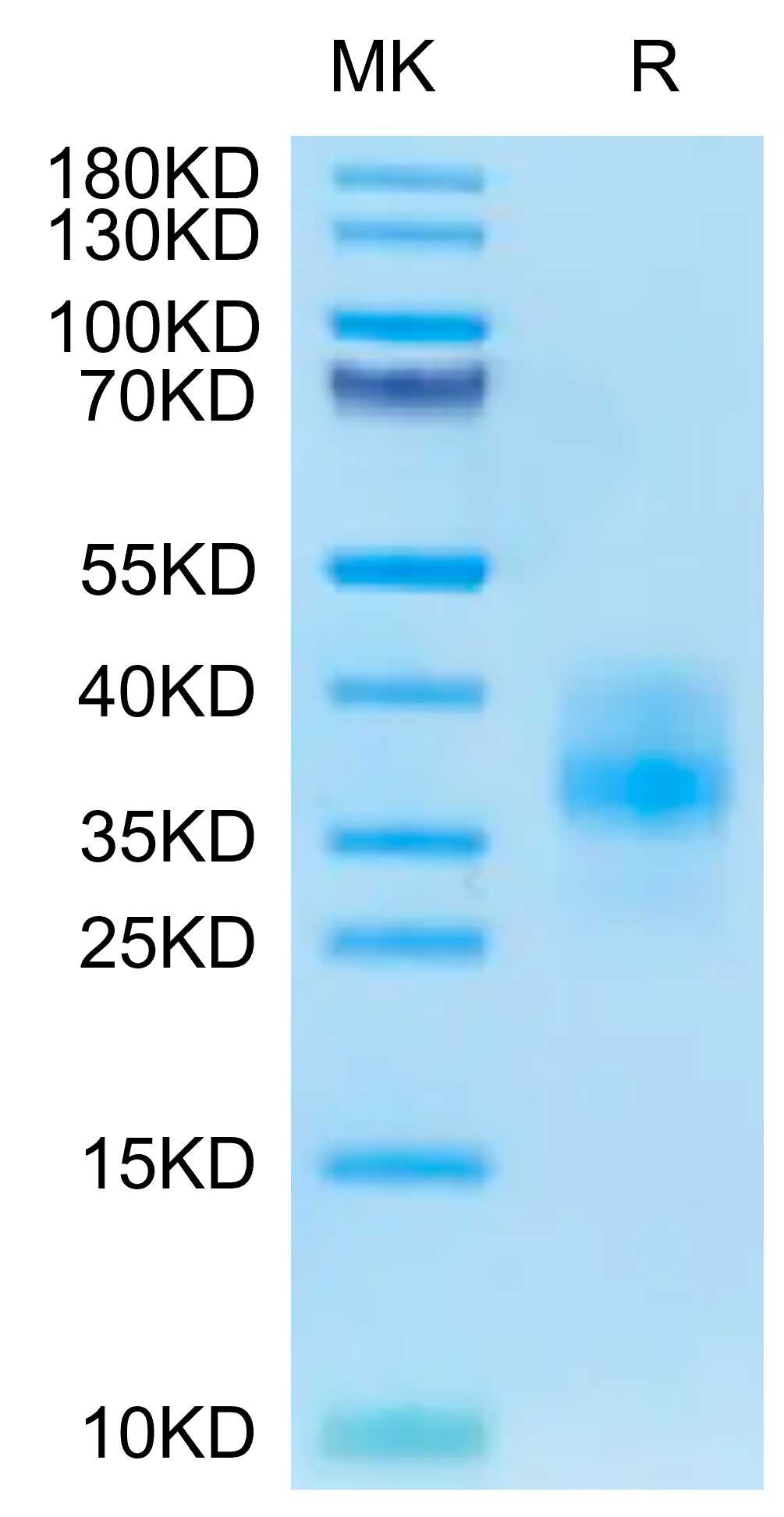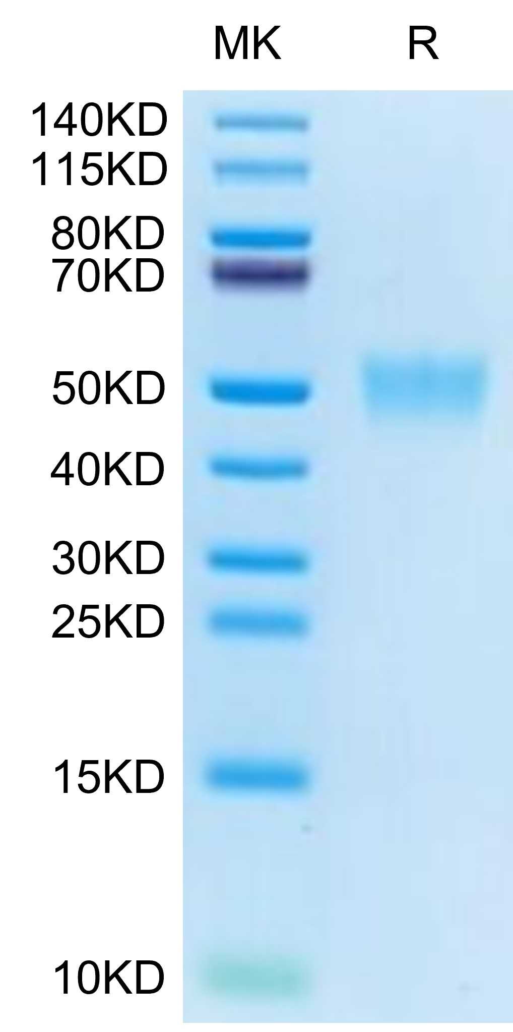 Human GITR Ligand, Fc Tag on SDS-PAGE under reducing (R) condition. The gel was stained overnight with Coomassie Blue. The purity of the protein is greater than