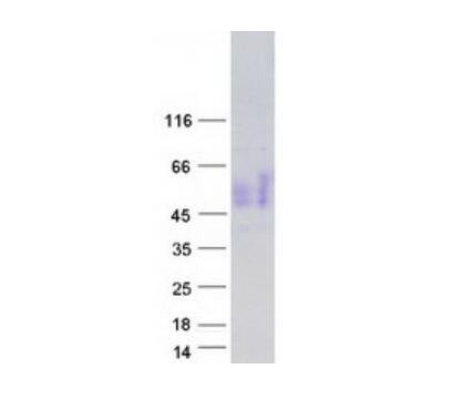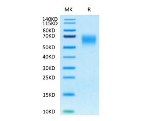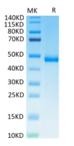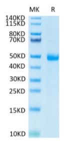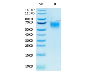 Human GITR Ligand, Fc Tag on SDS-PAGE under reducing (R) condition. The gel was stained overnight with Coomassie Blue. The purity of the protein is greater than