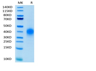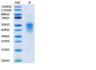 Human GITR Ligand, Fc Tag on SDS-PAGE under reducing (R) condition. The gel was stained overnight with Coomassie Blue. The purity of the protein is greater than