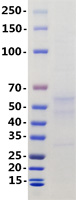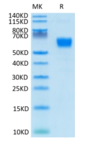 Human GITR Ligand, Fc Tag on SDS-PAGE under reducing (R) condition. The gel was stained overnight with Coomassie Blue. The purity of the protein is greater than