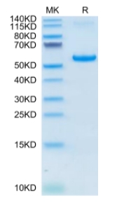 Human GITR Ligand, Fc Tag on SDS-PAGE under reducing (R) condition. The gel was stained overnight with Coomassie Blue. The purity of the protein is greater than