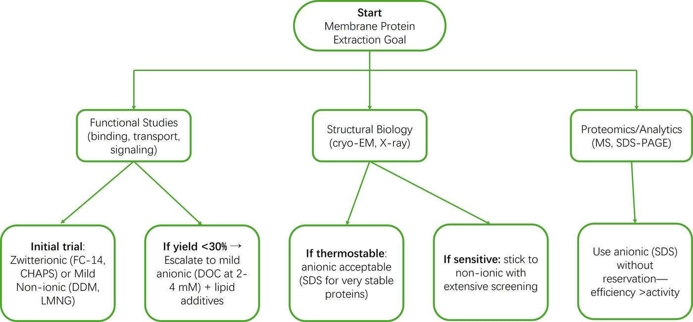 Critical limitation: SDS binds to proteins at ~1.4 g/g ratio, coating them with a uniform negative charge that prevents refolding. While excellent for analytical workflows, SDS is contraindicated for functional studies unless followed by exhaustive detergent exchange.