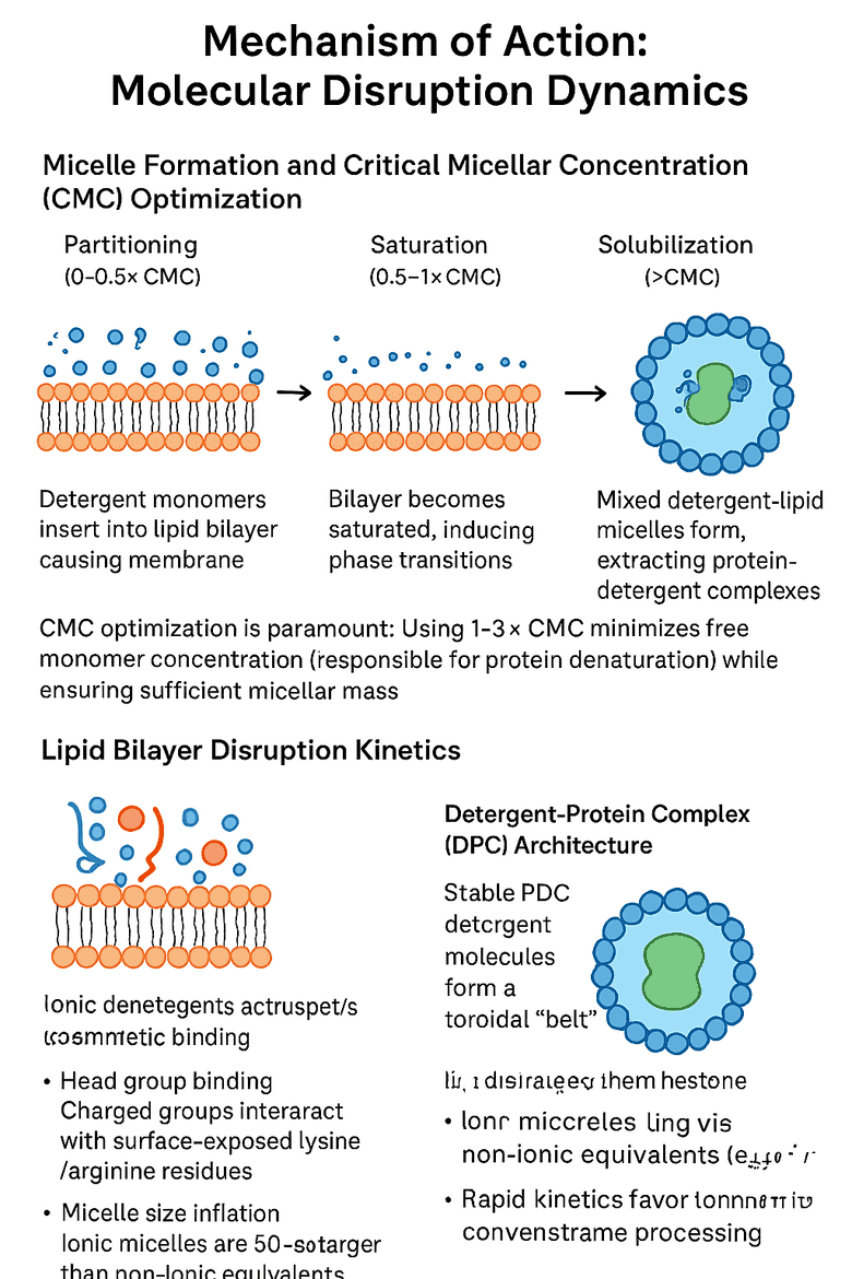 - Solubilization (>CMC): Mixed detergent-lipid micelles form, extracting protein-detergent complexes (PDCs)