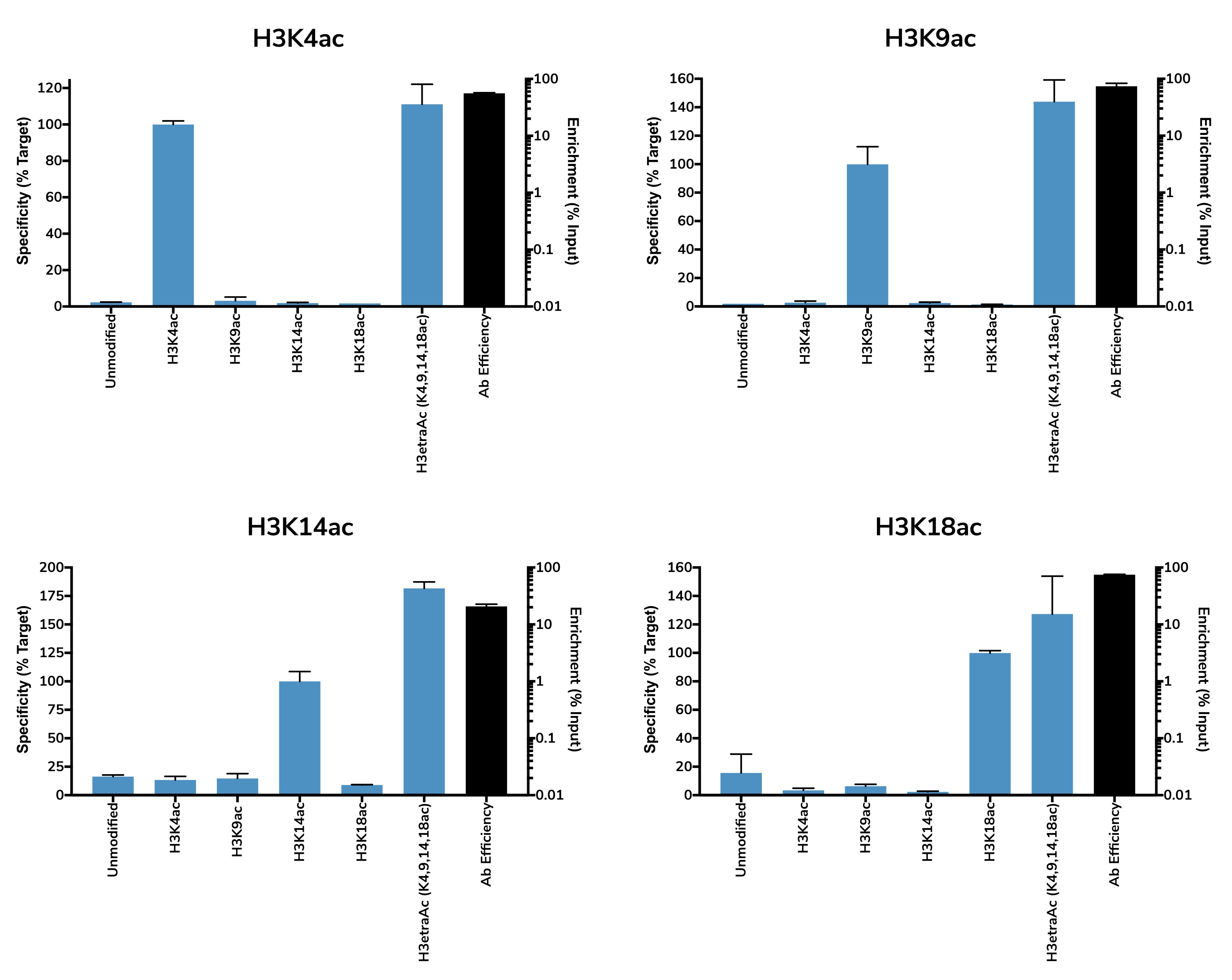 | Applications : | SNAP-ChIP K-AcylStat barcoded nucleosome standards are highly purified recombinant mononucleosomes and are suitable for use as spike-in controls for ChIP reactions, for antibody specificity testing or for effector protein binding experiments. See product manual for more information. SNAP-ChIP can easily be introduced into existing ChIP and ChIP-seq workflows for experiment normalization and monitoring of technical variability. |