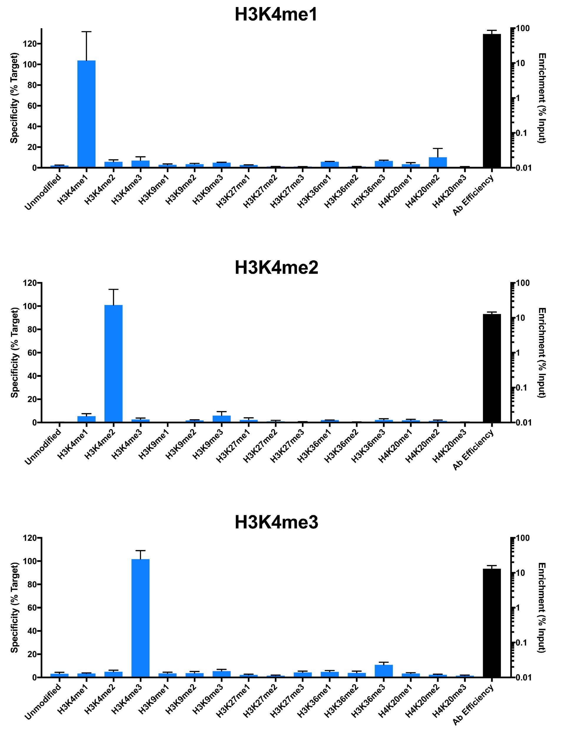 | Applications : | SNAP-ChIP K-MetStats are highly purified recombinant mononucleosomes and are suitable for use as spike-in controls for ChIP reactions, for antibody specificity testing or for effector protein binding experiments. SNAP-ChIP K-MetStats do not contain detectable levels of free DNA which could alter assayed activities. See manual for more information. SNAP-ChIP can easily be introduced into existing ChIP and ChIP-seq workflows for experiment normalization and monitoring of technical variability. |
