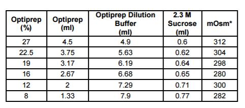 Preparation : | It is recommended to use ultrapure water (17 MW×cm or equivalent) when preparing the reagents. 250 mM Calcium Chloride Solution - Dilute an aliquot of the 2.5 M calcium chloride solution 10-fold with ultrapure water. 1×Extraction Buffer - Dilute an aliquot of the Extraction Buffer 5× 5-fold with ultrapure water. Keep the diluted Extraction Buffer at 2–8 centigrade until use. Just before use add the Protease Inhibitor Cocktail for mammalian cell and tissue extracts to the diluted Extraction Buffer at a final concentration of 1% (v/v). The diluted Extraction Buffer with the 1% (v/v) Protease Inhibitor Cocktail is the 1× Extraction Buffer. Suggested volumes of 1× Extraction Buffer: · For tissue extracts: use a minimal tissue weight of 4 g and prepare 25 ml of buffer. · For cell culture extracts: use a minimum of 2-3×10^8 cells and prepare 10 ml of buffer. 1× Optiprep Dilution Buffer - Dilute an aliquot of the Optiprep Dilution Buffer 20× 20-fold with ultrapure water. Keep the 1× Optiprep Dilution Buffer at 2-8 centigrade until use. Suggested volumes of 1× Optiprep Dilution Buffer: · For tissue extracts from 4 g of tissue: 40 ml · For cell culture extracts from at least 2 × 108 cells: 30 ml Optiprep Density Gradient Medium Solutions - Prepare 10 ml of each Optiprep Density Gradient Medium Solution. The OptiPrep Density Gradient Mediumsupplied with the kit is a 60% (w/v) solution in water. Table 1 shows the final concentration of each Optiprep Density Gradient Medium Solution after dilution. The diluted solutions need to be osmotically balanced with sucrose to ~290 mOsm. These Optiprep Density Gradient Medium Solutions may be kept at 2–8 centigrade for up to 4 weeks, if prepared aseptically. |