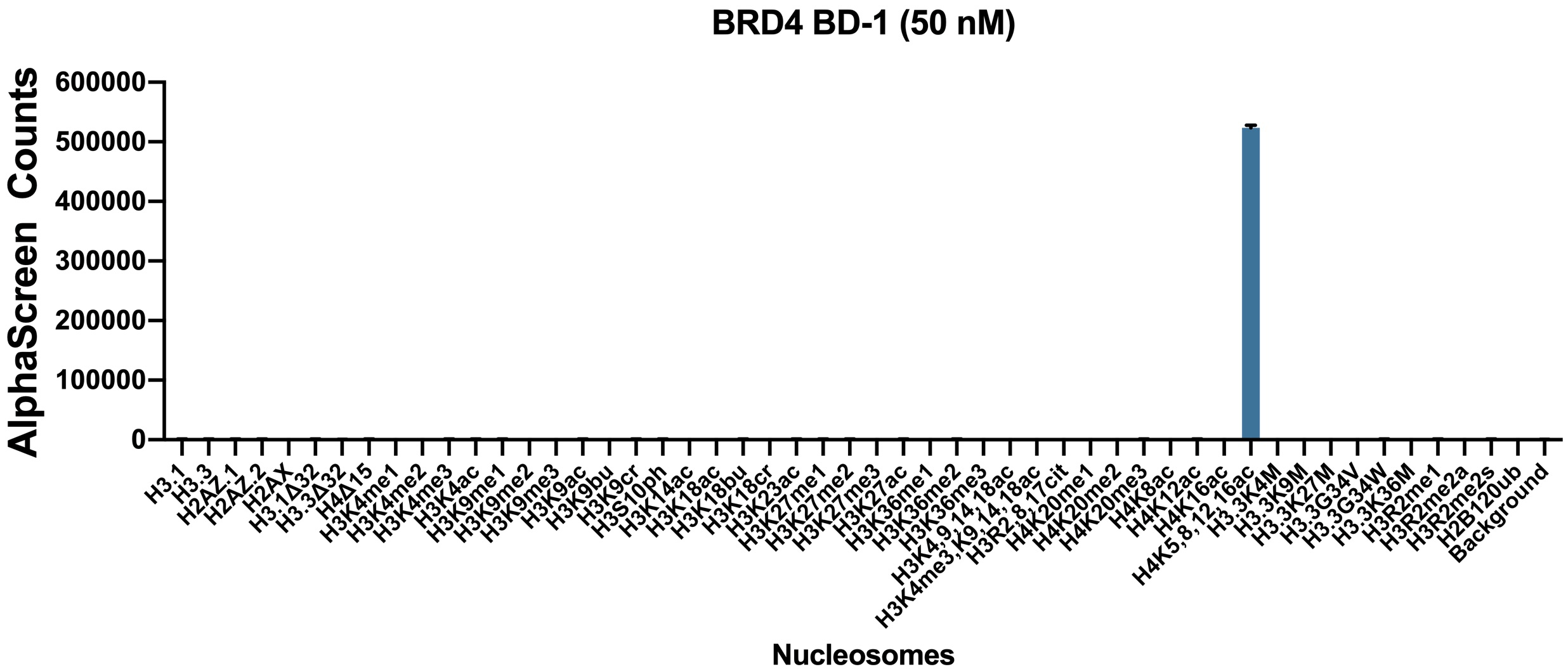 Applications : | The access to epigenetic diversity in a physiological nucleosome context enables broad end-user applications, including nucleosome binding studies (e.g. chromatin reader binding preferences, see application data below for example using BRD4 BD-1), enzyme screening assays (e.g. identification of preferred substrates), and antibody specificity testing (e.g. for applications that require antibody specificity in a nucleosome, rather than histone peptide context). The biotin group on the DNA facilitates pull-down experiments. Mononucleosomes do not contain free DNA which could alter assayed activities. |