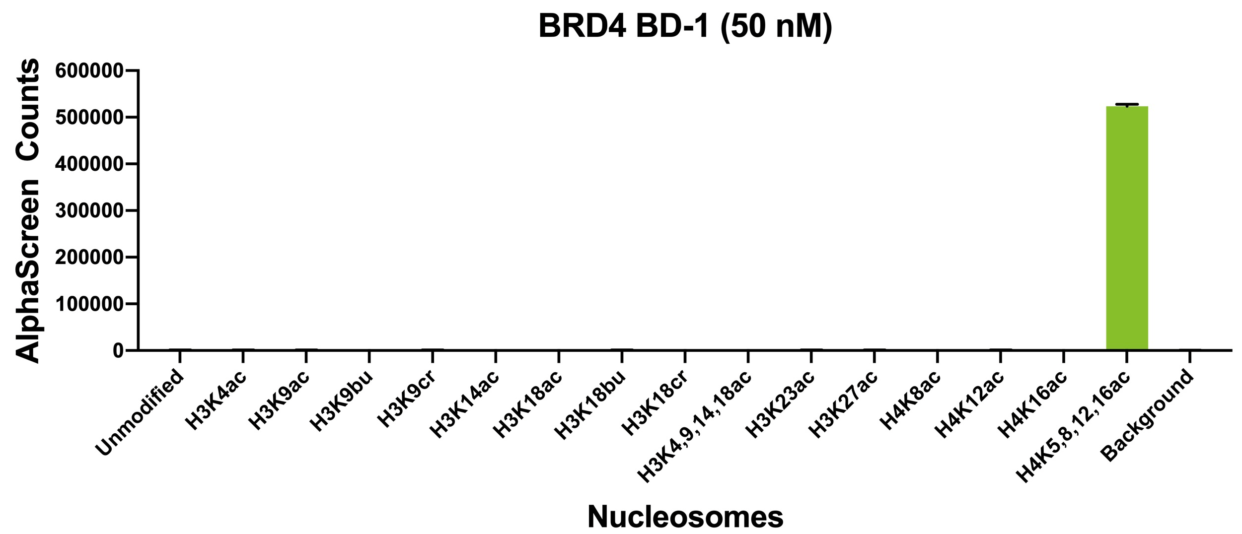 Applications : | The access to epigenetic diversity in a physiological nucleosome context enables broad end-user applications, including nucleosome binding studies (e.g. chromatin reader binding preferences, see application data below for example using BRD4 BD-1), enzyme screening assays (e.g. identification of preferred substrates), and antibody specificity testing (e.g. for applications that require antibody specificity in a nucleosome, rather than histone peptide context). The biotin group on the DNA facilitates pull-down experiments. Mononucleosomes do not contain free DNA which could alter assayed activities. |
