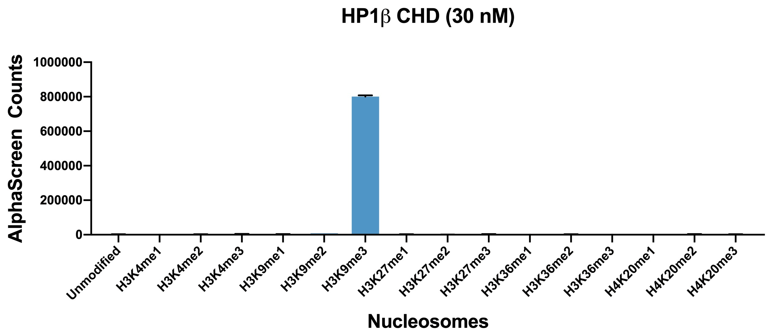 Applications : | The access to epigenetic diversity in a physiological nucleosome context enables broad end-user applications, including nucleosome binding studies (e.g. chromatin reader binding preferences, see application data below for example using HP1β CHD), enzyme screening assays (e.g. identification of preferred substrates), and antibody specificity testing (e.g. for applications that require antibody specificity in a nucleosome, rather than histone peptide context). The biotin group on the DNA facilitates pull-down experiments. Mononucleosomes do not contain free DNA which could alter assayed activities. |