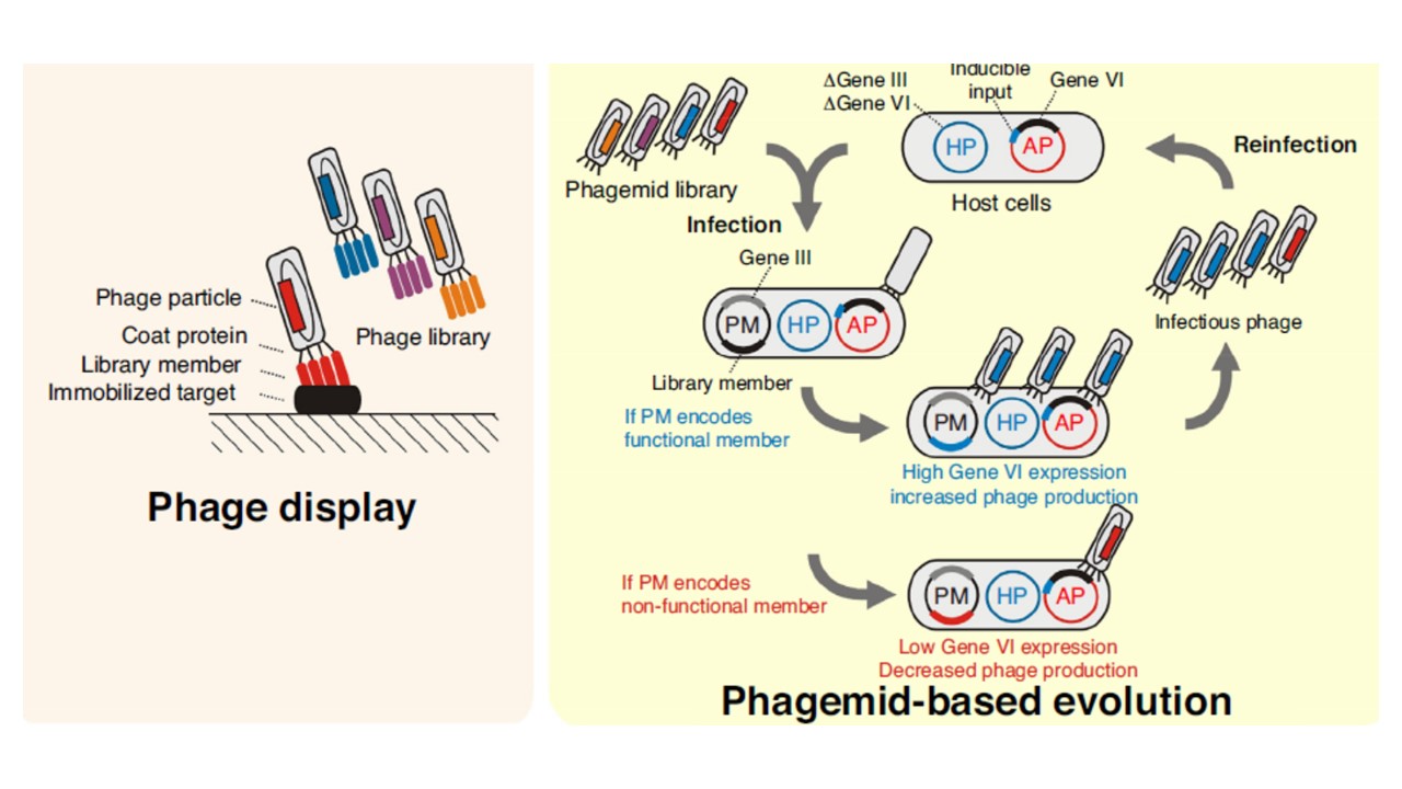Phage display can be applied both in vitro and in vivo. In vitro systems typically involve the incorporation of genes encoding peptides or proteins into bacteriophage coat proteins (such as M13 pIII), enabling selection against a target molecule. In contrast, Phage- Assisted Continuous Evolution (PACE) —developed by David Liu and collaborators—permits continuous, in vivo evolution of proteins with complex functions, such as aminoacyl-tRNA synthetases.