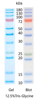Product Overview : | Effective Size Range: 10kDa to 180 kDa. Protein Bands: 10kDa, 15kDa, 20kDa, 25kDa, 30kDa, 40kDa, 50kDa, 72kDa, 100kDa, 130kDa, 180kDa. The 72 kDa band is orange and the 25 kDa band is green. This product is suitable as a protein molecular weight standard for SDS-PAGE and Western Blot. Ready-to-use: No need to heat, dilute or add reducing agents before use. Loading Volumes: 5-10μL |