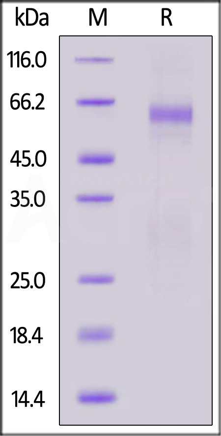 | Molecular Mass : | The protein has a calculated MW of 47.2 kDa. The protein migrates as 50-65 kDa under reducing (R) condition (SDS-PAGE) due to glycosylation. |