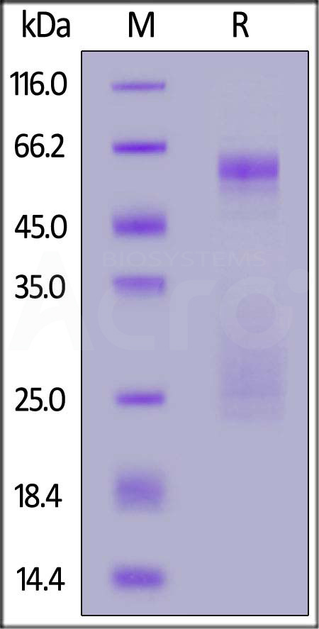 | Molecular Mass : | The protein has a calculated MW of 47.3 kDa. The protein migrates as 55-65 kDa under reducing (R) condition (SDS-PAGE) due to glycosylation. |