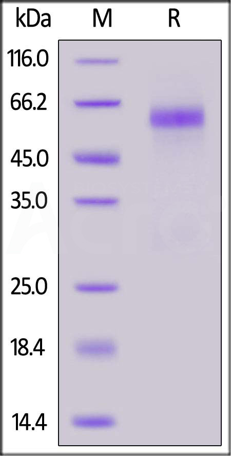 | Molecular Mass : | The protein has a calculated MW of 47.3 kDa. The protein migrates as 55-65 kDa under reducing (R) condition (SDS-PAGE) due to glycosylation. |