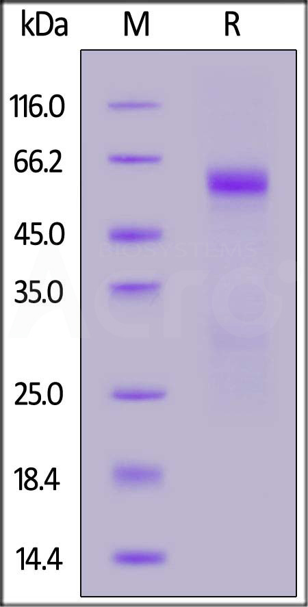 | Molecular Mass : | The protein has a calculated MW of 47.3 kDa. The protein migrates as 55-65 kDa under reducing (R) condition (SDS-PAGE) due to glycosylation. |