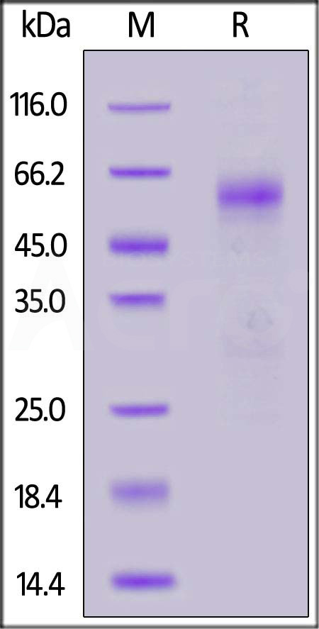 | Molecular Mass : | The protein has a calculated MW of 47.3 kDa. The protein migrates as 55-65 kDa under reducing (R) condition (SDS-PAGE) due to glycosylation. |