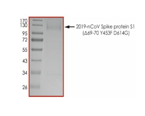 | Product Overview : | Recombinant 2019-nCoV Spike protein S1 (Δ69-70, Y453F, D614G) (16-685) was expressed in CHO cells using a C-terminal His-tag. |