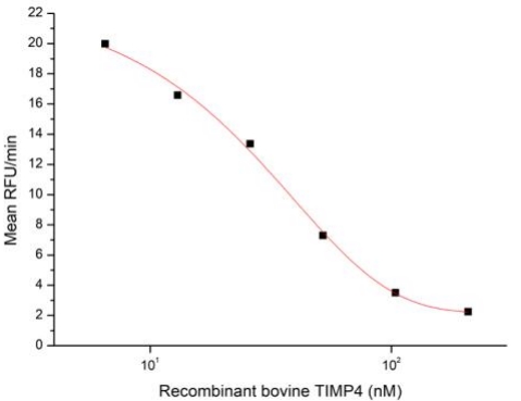 Tissue Inhibitors of Metalloproteinase 4 (TIMP4) is an enzyme that in humans is encoded by the TIMP4 gene. This gene belongs to the tissue inhibitor of metalloproteinases gene family. The proteins encoded by this gene family are inhibitors of the matrix metalloproteinases, a group of peptidases involved in degradation of the extracellular matrix. The secreted, netrin domain-containing protein encoded by this gene is involved in regulation of platelet aggregation and recruitment and may play role in hormonal regulation and endometrial tissue remodeling. The activity of recombinant bovine TIMP4 was measured by its ability to inhibit rhMMP2 cleavage of a fluorogenic peptide substrate MCA-Pro-Leu-Gly-Leu-DPA-Ala-Arg-NH2 in the assay buffer 50 mM Tris, 10 mM CaCl2, 150 mM NaCl, 0.05% (w/v) Brij-35, pH 7.5. rhMMP2 was diluted to 100 ug/ml and activated with 1 mM APMA at 37°C for 1 hour and rbTIMP4 (MW: 24.05 KD) was diluted to different concentrations with the assay buffer. Mix 8 µl of rbTIMP4 curve dilutions, 12.8 µl of activated rhMMP-2, and 59.2 µl of assay buffer, including a control containing assay buffer and the diluted rhMMP-2 and incubate the reactions for 2 hours at 37°C. Loading 50 µl of the incubated mixtures which were diluted five-fold in assay buffer into empty wells of a plate, and start the reaction by adding 50 µl of 20 µM substrate. Include a substrate blank containing 50 µl of assay buffer and 50 µl of 20 µM substrate. Then read at excitiation and emission wavelengths of 320 nm and 405 nm, respectively, in kinetic mode for 5 minutes. The result was shown and it was obvious that recombinant bovine TIMP4 significantly decreased rhMMP2 activity. The inhibition IC50 was <27 nM. |