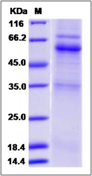 Molecular Mass : | The recombinant canine ANGPTL7/Fc is a disulfide-linked homodimer. The reduced monomer comprises 559 amino acids and has a predicted molecular mass of 63.8 kDa. The apparent molecular mass of the protein is approximately 57 kDa in SDS-PAGE under reducing |