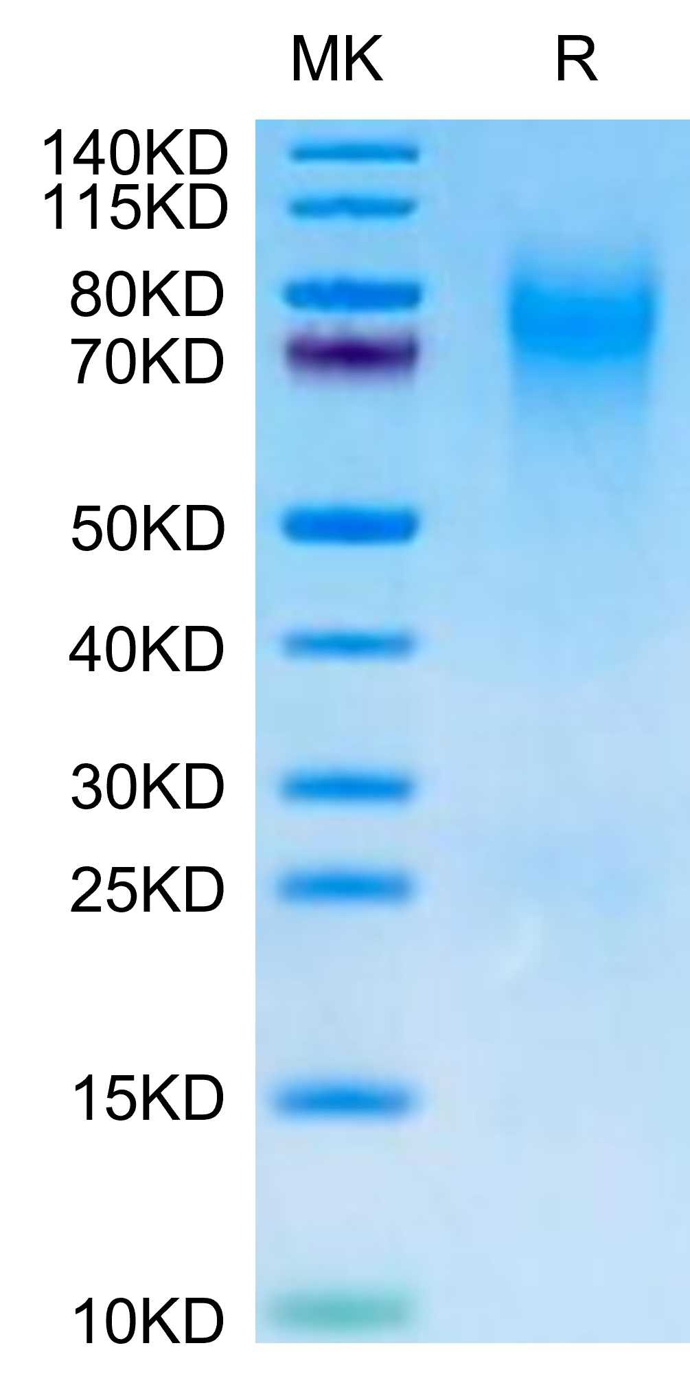 | Molecular Mass : | The protein has a predicted MW of 43.62 kDa. Due to glycosylation, the protein migrates to 68-88 kDa based on Tris-Bis PAGE result. |