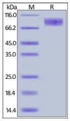 | Molecular Mass : | The protein has a calculated MW of 56.1 kDa. The protein migrates as 70-100 kDa under reducing (R) condition (SDS-PAGE) due to glycosylation. |