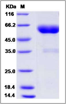 Molecular Mass : | The recombinant canine EFNB2/Fc is a disulfide-linked homodimer. The reduced monomer comprises 443 amino acids and has a predicted molecular mass of 49.2 kDa. The apparent molecular mass of the protein is approximately 58 and 35 kDa in SDS-PAGE under redu |
