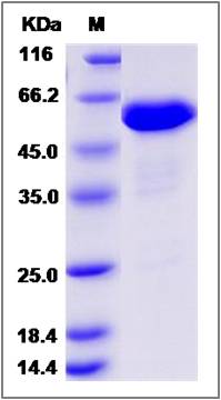 The recombinant canine EFNA5/Fc is a disulfide-linked homodimer. The reduced monomer comprises 424 amino acids and has a predicted molecular mass of 48.2 kDa. The apparent molecular mass of the protein is approximately 55-60 kDa in SDS-PAGE under reducing |