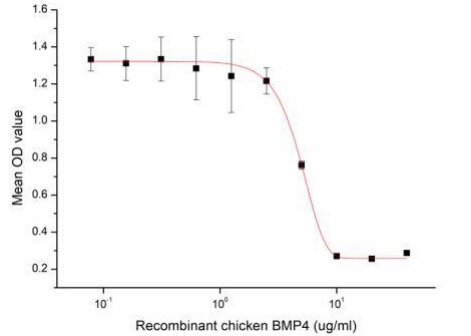 BMP4 (Bone morphogenetic protein 4) is a member of the bone morphogenetic protein family, which is involved in bone and cartilage development, specifically tooth and limb development and fracture repair. To test the effect of BMP4 on cell apoptosis, HepG2 cells were seeded into triplicate wells of 96-well plates at a density of 4,000 cells/well and allowed to attach overnight, then the medium was replaced with various concentrations of recombinant chicken BMP4 diluted with 5% serum standard DMEM. After incubated for 72h, cells were observed by inverted microscope and cell proliferation was measured by Cell Counting Kit-8 (CCK-8). Briefly, 10 µl of CCK-8 solution was added to each well of the plate, then the absorbance at 450 nm was measured using a microplate reader after incubating the plate for 1-4 hours at 37°C. Apoptosis of HepG2 cells after incubation with BMP4 for 72h observed by inverted microscope was shown. Cell viability was assessed by CCK-8 (Cell Counting Kit-8 ) assay after incubation with recombinant chicken BMP4 for 72h. BMP4 significantly decreased cell viability of HepG2 cells. The ED50 of recombinant chicken BMP4 is 4.86 ug/ml. |