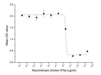 Interferon-alpha (IFNa), also known as leukocyte interferon, represents a group of related but distinct proteins that share over 95% amino acid sequence homology. They are members of the type I interferon family which share a common cell surface receptor composed of two subunits. IFN-α has both anti-viral and immunomodulatory activities on target cells. To test the effect of IFNa on cell apoptosis, A549 cells were seeded into triplicate wells of 96-well plates at a density of 4,000 cells/well and allowed to attach overnight, then the medium was replaced with various concentrations of recombinant chicken IFNa diluted with 5% serum standard DMEM. After incubated for 72h, cells were observed by inverted microscope and cell proliferation was measured by Cell Counting Kit-8 (CCK-8). Briefly, 10 µl of CCK-8 solution was added to each well of the plate, then the absorbance at 450 nm was measured using a microplate reader after incubating the plate for 1-4 hours at 37°C. Apoptosis of A549 cells after incubation with IFNa for 72h observed by inverted microscope was shown. Cell viability was assessed by CCK-8 (Cell Counting Kit-8 ) assay after incubation with recombinant chicken IFNa for 72h. It was obvious that IFNa significantly decreased cell viability of A549 cells. The ED50 of recombinant chicken IFNa is 5.13 ug/ml. |