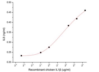 Interleukin 1 beta (IL-1β) also known as leukocytic pyrogen, leukocytic endogenous mediator, mononuclear cell factor, lymphocyte activating factor and other names, is a member of the interleukin 1 family of cytokines. This cytokine is an important mediator of the inflammatory response, and is involved in a variety of cellular activities, including cell proliferation, differentiation, and apoptosis. It has been reported that IL-1β can induced IL-8 production in A549 cells. To test the bioactivity of recombinant chicken IL-1β, A549 cells were seeded into 24-well plate at a density of 1x10^5 cells/mL, and allowed to attach overnight before treated with certain concentrations of recombinant chicken IL-1β for 48h and IL-8 levels in the cell supernatant were determined by ELISA (SEA080Hu). IL-8 levels in the cell supernatant of A549 cells increased significantly after stimulated with IL-1, the EC50 was 5.6 ug/ml. |