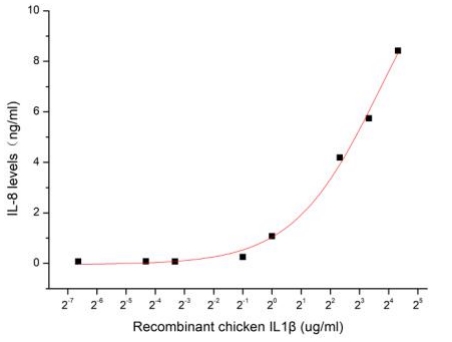 Interleukin 1 beta (IL-1β) also known as leukocytic pyrogen, leukocytic endogenous mediator, mononuclear cell factor, lymphocyte activating factor and other names, is a member of the interleukin 1 family of cytokines. This cytokine is an important mediator of the inflammatory response, and is involved in a variety of cellular activities, including cell proliferation, differentiation, and apoptosis. It has been reported that IL-1β can induced IL-8 production in A549 cells. To test the bioactivity of recombinant chicken IL-1β, A549 cells were seeded into 24-well plate at a density of 1x10^5 cells/mL, and allowed to attach overnight before treated with certain concentrations of recombinant chicken IL-1β for 24h and IL-8 levels in the cell supernatant were determined by ELISA (SEA080Hu). IL-8 levels in the cell supernatant of A549 cells increased significantly after stimulated with IL-1β, the EC50 was 56 ug/ml. |