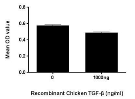 Transforming growth factor beta (TGF-β) is a multifunctional cytokine belonging to the transforming growth factor superfamily. The TGF-β superfamily includes endogenous growth inhibiting proteins; an increase in expression of TGF-β often correlates with the malignancy of many cancers and a defect in the cellular growth inhibition response to TGF-β. Its immunosuppressive functions then come to dominate, contributing to oncogenesis. To test the effect of TGF-β on inhibit HGF-dependent proliferation, HepG2 cells were seeded into triplicate wells of 96-well plates at a density of 2,000 cells/well and allowed to attach, replaced with serum-free overnight, then the medium was replaced with 2% serum standard DMEM including 1ng/mL HGF prior to the addition of various concentrations of recombinant chicken TGF-β. After incubated for 96h, cells were observed by inverted microscope and cell proliferation was measured by Cell Counting Kit-8 (CCK-8). Briefly, 10µL of CCK-8 solution was added to each well of the plate, then the absorbance at 450nm was measured using a microplate reader after incubating the plate for 1-4 hours at 37°C. The inhibitory effect of TGF-β on HGF-dependent proliferation of HepG2 cells observed by inverted microscope was shown. Cell viability was assessed by CCK-8 assay after incubation with recombinant TGF-β for 96h. It was obvious that TGF-β significantly decreased cell viability of HepG2 cells. |