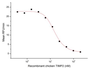 Tissue inhibitors of metalloproteinases or TIMPs are a family of proteins that regulate the activation and proteolytic activity of the zinc enzymes known as matrix metalloproteinases (MMPs). There are four members of the family, TIMP-1, TIMP-2, TIMP-3, and TIMP-4. TIMP-2 is a non N-glycosylated protein with a molecular mass of 22 kDa produced by a wide range of cell types, which inhibits MMPs non-covalently by the formation of binary complexes. TIMP-2 also has erythroidpotentiating and cell growth promoting activities. The activity of recombinant chicken TIMP2 was measured by its ability to inhibit rhMMP2 cleavage of a fluorogenic peptide substrate MCA-Pro-Leu-Gly-Leu-DPA-Ala-Arg-NH2 in the assay buffer 50 mM Tris, 10 mM CaCl2, 150 mM NaCl, 0.05% (w/v) Brij-35, pH 7.5. rhMMP2 was diluted to 100 ug/ml and activated with 1 mM APMA at 37°C for 1 hour and rgTIMP2 (MW: 23 KD) was diluted to different concentrations with the assay buffer. Mix 8 µl of rgTIMP2 curve dilutions, 12.8 µl of activated rhMMP-2, and 59.2 µl of assay buffer, including a control containing assay buffer and the diluted rhMMP-2 and incubate the reactions for 2 hours at 37°C. Loading 50 µl of the incubated mixtures which were diluted five-fold in assay buffer into empty wells of a plate, and start the reaction by adding 50 µl of 20 µM substrate. Include a substrate blank containing 50 µl of assay buffer and 50 µl of 20 µM substrate. Then read at excitiation and emission wavelengths of 320 nm and 405 nm, respectively, in kinetic mode for 5 minutes. The result was shown and it was obvious that recombinant chicken TIMP2 significantly decreased rhMMP2 activity. The inhibition IC50 was <16 nM. |
