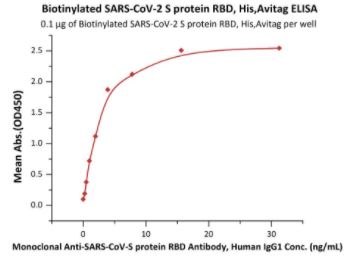 | Product Overview : | Recombinant COVID-19 S protein RBD, Biotinylated (Arg319-Phe541) was fused to His/Avi-tag at the C-terminus and expressed in human 293 cells (HEK293). |